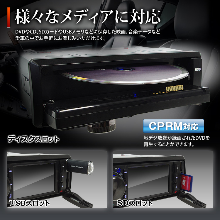 - 本体前面にモニターが埋め込まれていますのでメディアを装入するだけで映画や音楽を楽しめます。CPRM対応なのでご家庭で録画したDVDを車内で楽しむことができます。