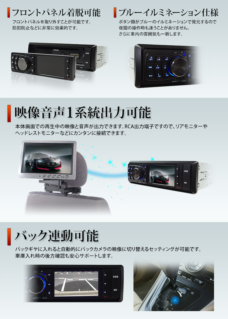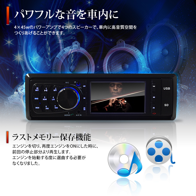 - 前面パネルにSD・USBスロットを装備。メモリーや音楽プレーヤーなどを接続することでMP3やDivX、デジカメ画像や動画ファイルなど様々なファイルが再生可能。(16GBまで対応)