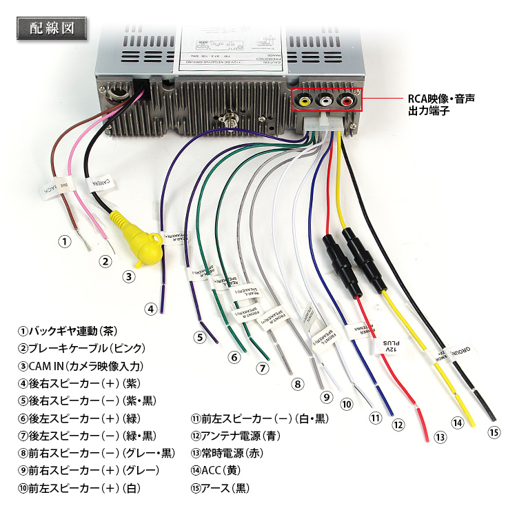 - 本体画面での再生中の映像と音声は出力可能です。RCA出力端子ですので、リアモニターなどにカンタンに接続できます。