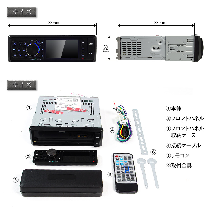 - リモコン×1、取付金具×1、接続ケーブル×1、説明書×1、フロントパネル収納ケース×1