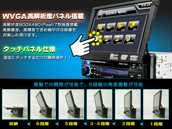- タッチパネル式7インチTFTワイド液晶採用。WVGAなので高画質!(800x480ピクセル)画面にタッチするだけの簡単操作、電動での開閉が可能で、最大6段階の角度調整が可能。