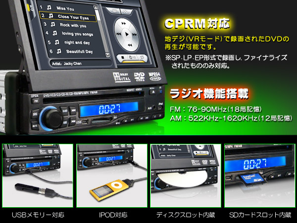 - MP3やDivX、デジカメ写真、圧縮動画ファイルも再生可能(表示言語は英語のみとなります。) SDカード の規格でなくてもUSB接続でほぼすべてのメモリー規格に対応!携帯用音楽プレーヤーやUSBメモリーのデータも読み込み可能(表示言語は英語のみとなります。)