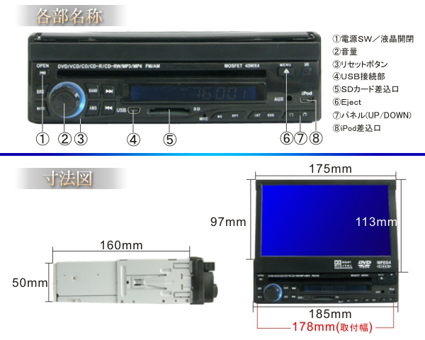 1DIN7インチワンセグ内蔵タッチパネル式DVDプレイヤー(1DINSE704A)