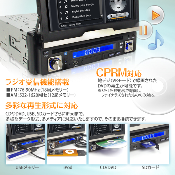 - MP3やDivX、デジカメ写真、圧縮動画ファイルも再生可能(表示言語は英語のみとなります。) SDカード の規格でなくてもUSB接続でほぼすべてのメモリー規格に対応!携帯用音楽プレーヤーやUSBメモリーのデータも読み込み可能(表示言語は英語のみとなります。)