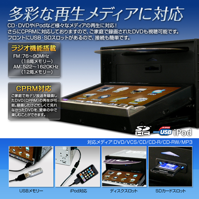 - MP3やDivX、デジカメ写真、圧縮動画ファイルも再生可能(表示言語は英語のみとなります。) SDカードの規格でなくてもUSB接続でほぼ すべてのメモリー規格に対応! !携帯用音楽プレーヤーやUSBメモリーのデータも読み込み可能(表示言語は英語のみとなります。)※I-Podは音楽再生のみ可能