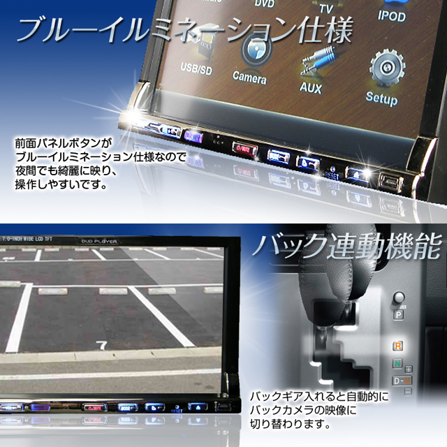 - タッチパネル採用7インチTFTワイド液晶採用!!画面にタッチするだけの簡単操作!!電動での開閉が可能で、最大7段階の角度調整が可能。設置場所の形状にこだわらず最適な角度でご覧頂けます。ボタンはブルーに発光し夜間の操作もラクラク!
