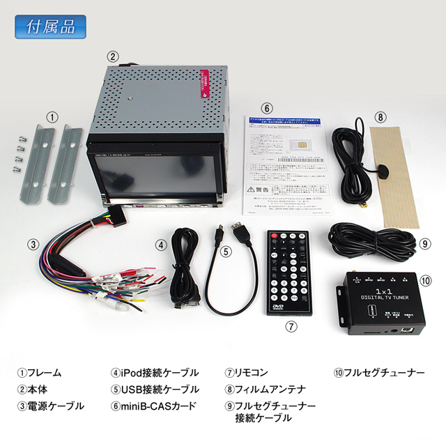 - リモコン×1、取付金具×1、USB接続ケーブル×1、ipod用接続ケーブル×1、フィルムアンテナ×1、mini-Bcasカード×1