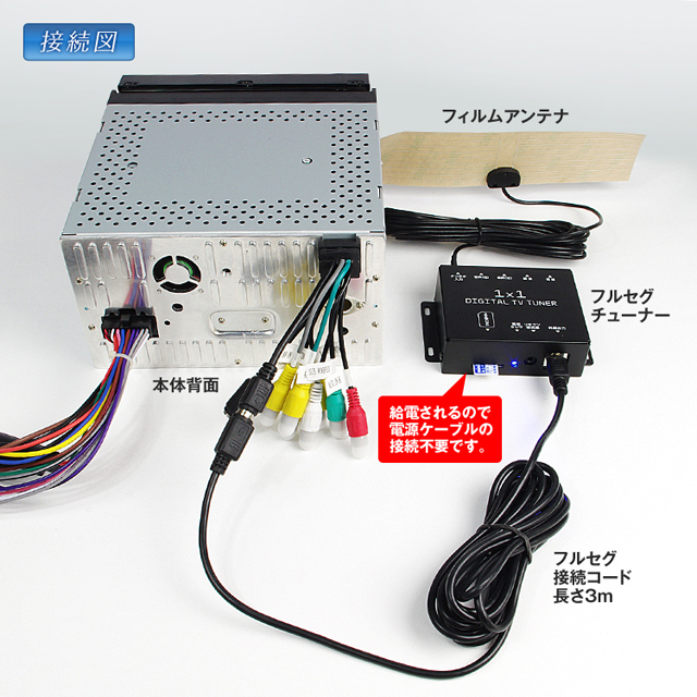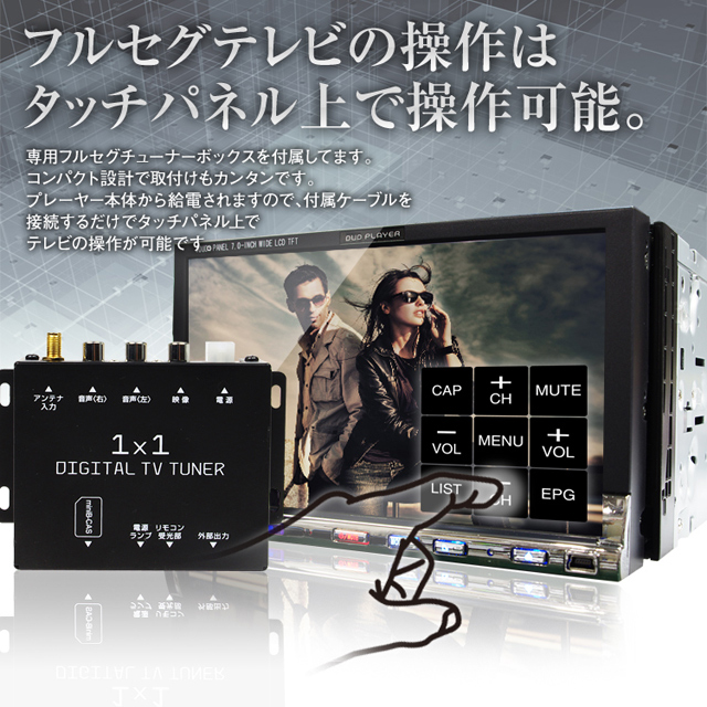 - 外付け車載用地上波デジタルチューナーをセット!デッキ本体から給電されるので付属ケーブルを接続するだけ!フルセグテレビの操作はデッキ本体のタッチパネルで操作が行えます。