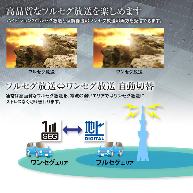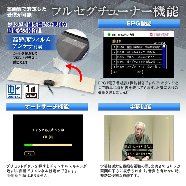 - EPG(電子番組ガイド)や番組紹介機能付ですので、お気に入りの番組内容が良くわかります。ボタンひとつで出演者や番組詳細内容などの詳細データを受信し、番組内容は一目瞭然。また、字幕放送対応番組を視聴の際、 出演者のセリフが画面の下方に表示されます。カースピーカーで音楽を再生している時や音声を出せない時に字幕表示が現れてスゴク便利な機能です。