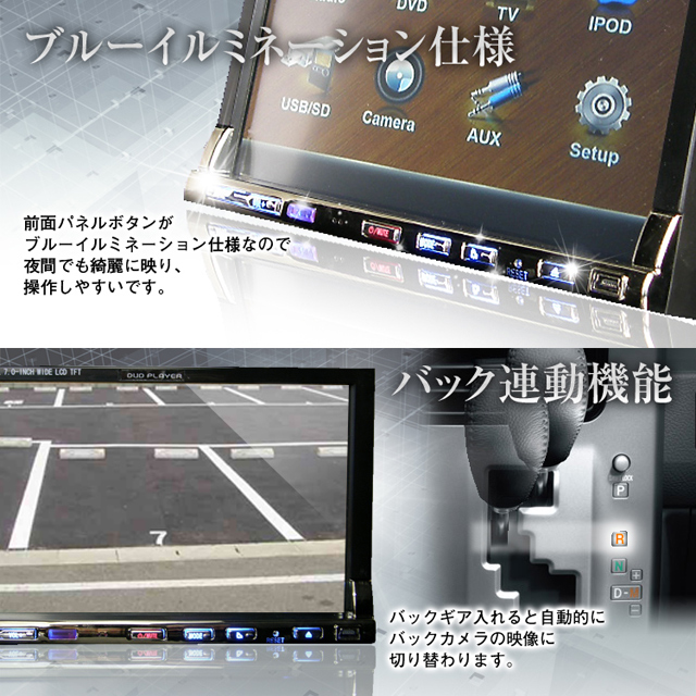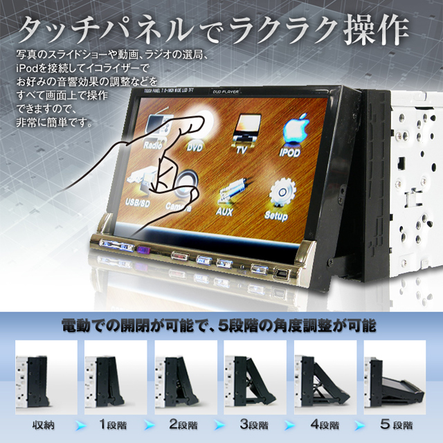 - タッチパネル採用7インチTFTワイド液晶採用!!画面にタッチするだけの簡単操作!!電動での開閉が可能で、最大7段階の角度調整が可能。設置場所の形状にこだわらず最適な角度でご覧頂けます。ボタンはブルーに発光し夜間の操作もラクラク!