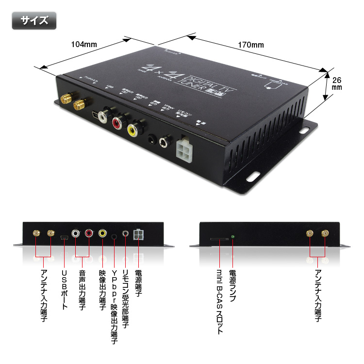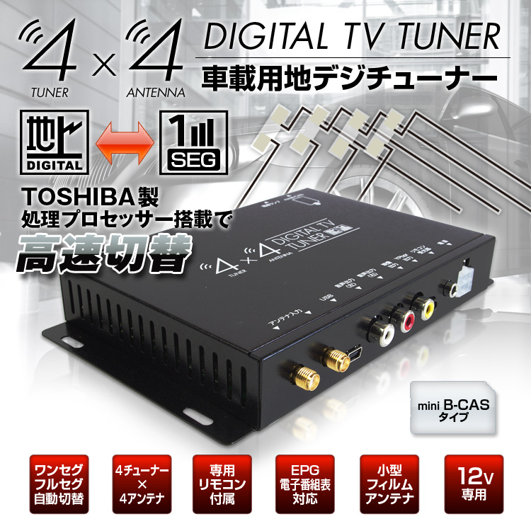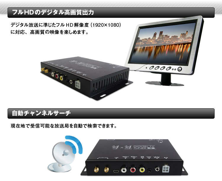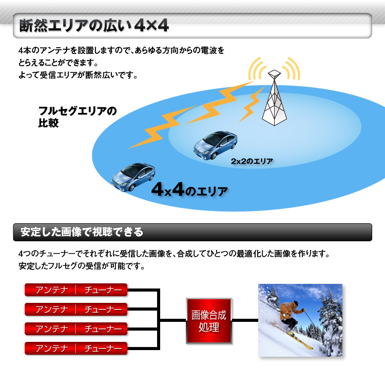 - 車載チューナーの中、最高グラスの4チューナー搭載。ダイバーシティー方式で受信環境のよいアンテナを自動検出しますので、より安定した画像を楽しめます。