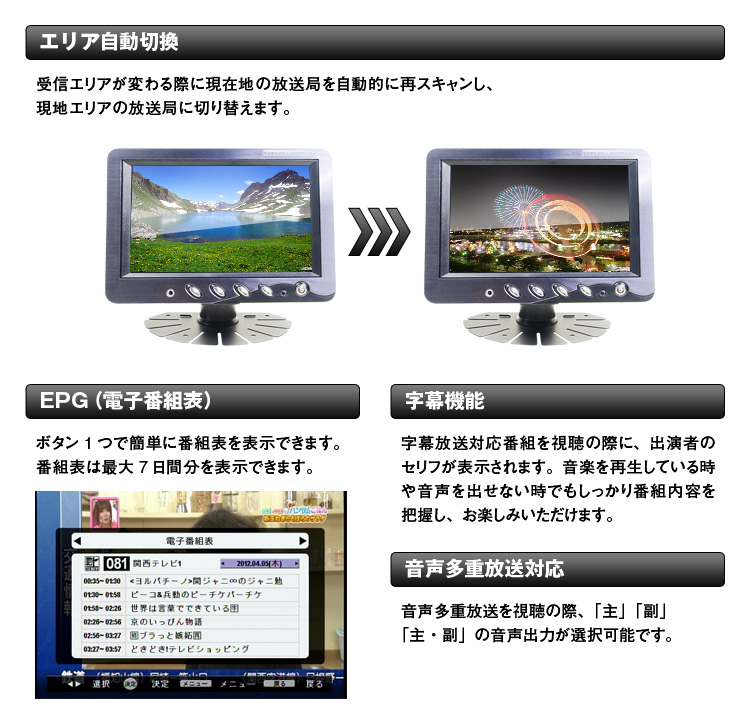 - 受信エリアが変わる際に現在地の放送局を自動的に再スキャンし、現地エリアに切り替えます。 ※当機能は自動/手動両方設定可能です。