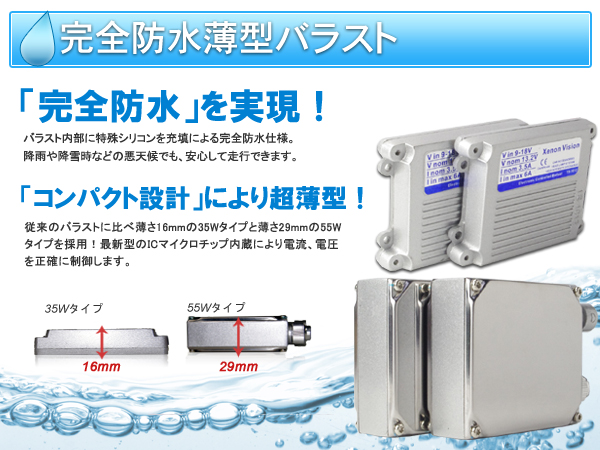- 従来のバラストに比べ薄さ16mmの35Wタイプと薄さ29mmの55Wタイプを採用!最新型のICマイクロチップ内蔵により電流、電圧を正確に制御します。