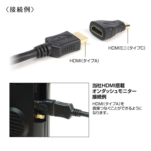 ■HDMI(タイプA)をHDMIミニ(タイプC)に変換するコネクタです。当店で販売しているモニターはHDMIミニ(タイプC)対応なので、お持ちの機器がHDMI(タイプA)の場合は本製品を使えば、簡単に接続する事ができます!