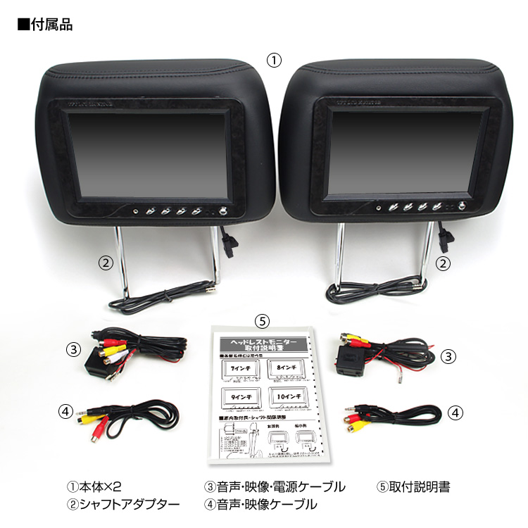 - 本体×2/シャフトアダプタ×2/音声・映像・電源ケーブル×2/音声・映像ケーブル×2/取付説明書