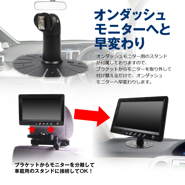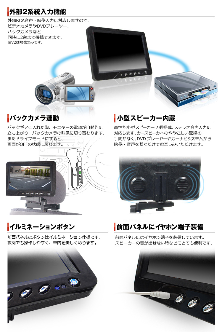 - 映像や音声などの入力は全て汎用性高いRCA端子を採用し、カーナビ、DVDプレーヤー、バックカメラなどは簡単に接続できます。