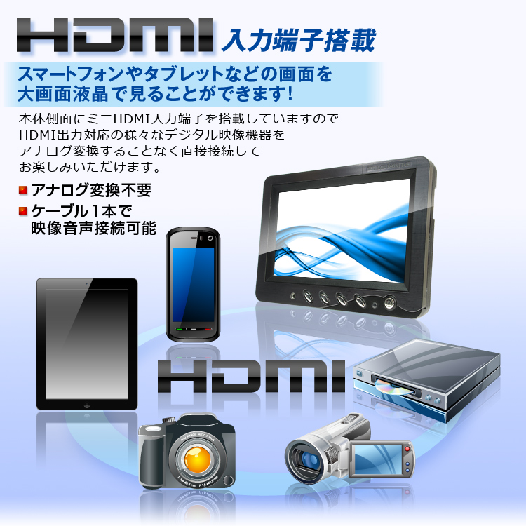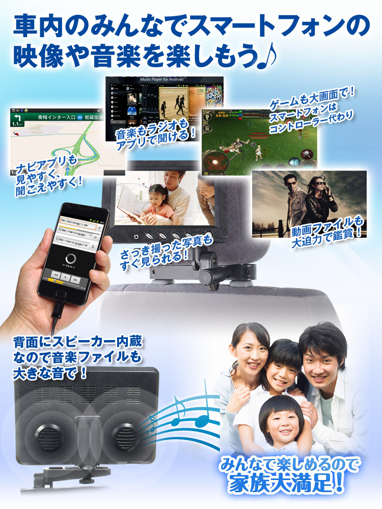 - 本製品はHDMI端子対応により、ご使用のスマートフォン(iPhoneなど)をモニターと接続し、車内でもスマートフォンのアプリや動画、インターネットなど大画面で表示できます!