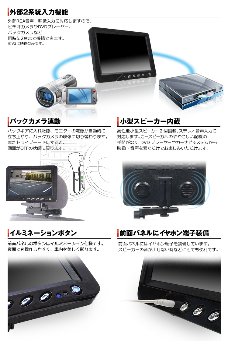 - V1/V2は汎用性の高いRCA端子を採用、カーナビやDVDプレーヤー、バックカメラへの接続対応可能です。更にHDMI端子からの入力が可能、持込のスマートフォンやビデオカメラにも出力対応可能です。