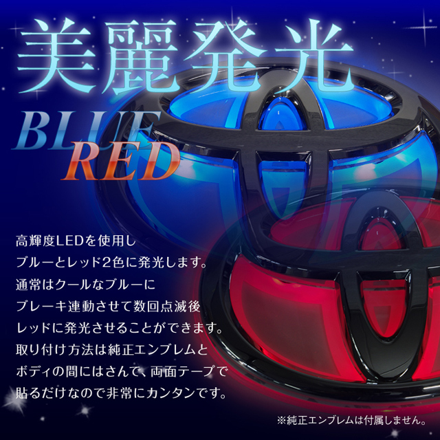 - 通常はブルーに点灯しますが、ブレーキと連動させるとブレーキを掛けた時にエンブレムの色がレッドに変化します!もちろんLEDの色を常時ブルー、レッドでの点灯も可能です。