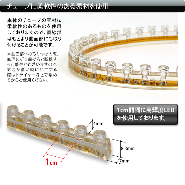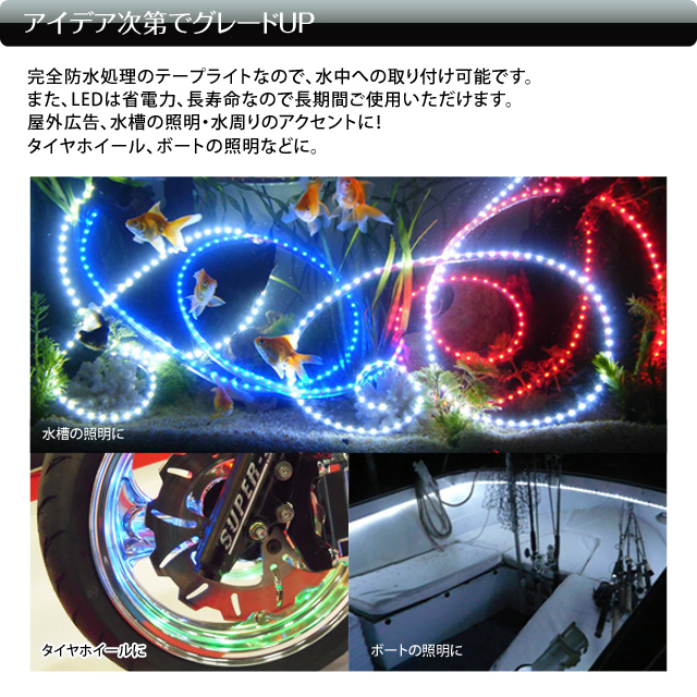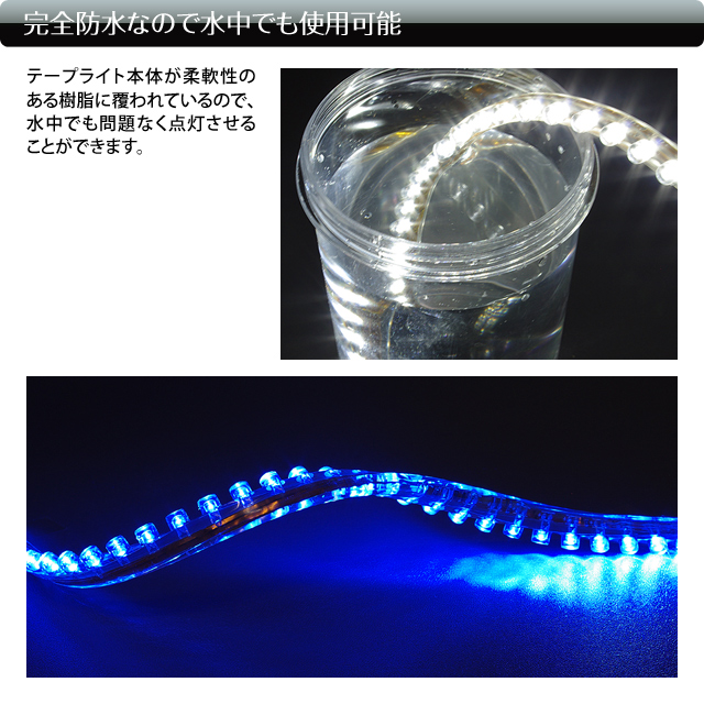 - 通常のLEDテープライトとは異なりシリコンチューブ全体が発光しているように見えるので非常に美しい!完全防水なので水中でも使用可能なスグレモノです!車やバイクの外装に最適ですし、家庭用電源加工を行えば屋内外の照明としてもご利用頂けます。