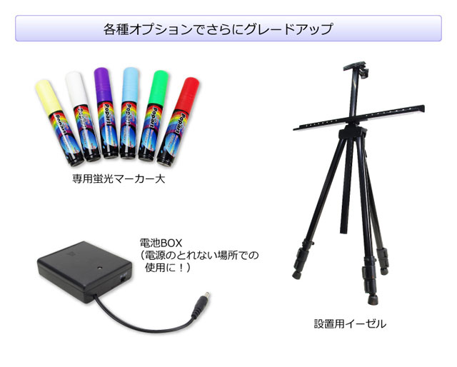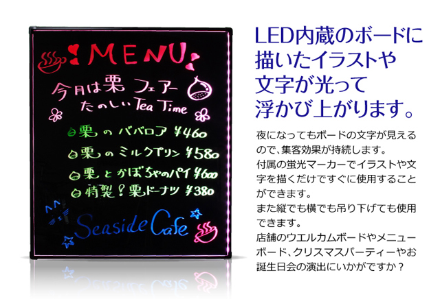 - LED内蔵のボードに描いた絵や文字が光る。今まで、黒板を利用していた方からのご要望で「LEDメニューボード」は開発されました!