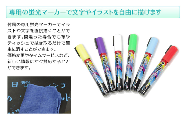 - 間違っても布やティッシュで擦るだけで簡単に消すことができます。文字の書き換えも簡単で何度でも書き可能です。店舗のウェルカムボードやメニューボード、クリスマスパーティーやお誕生日会にいかがでしょうか?