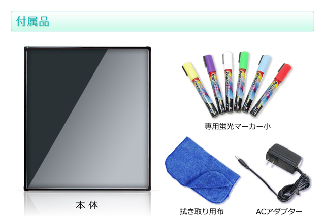 - 本体、ACアダプター、拭き取り布、マーカー6本