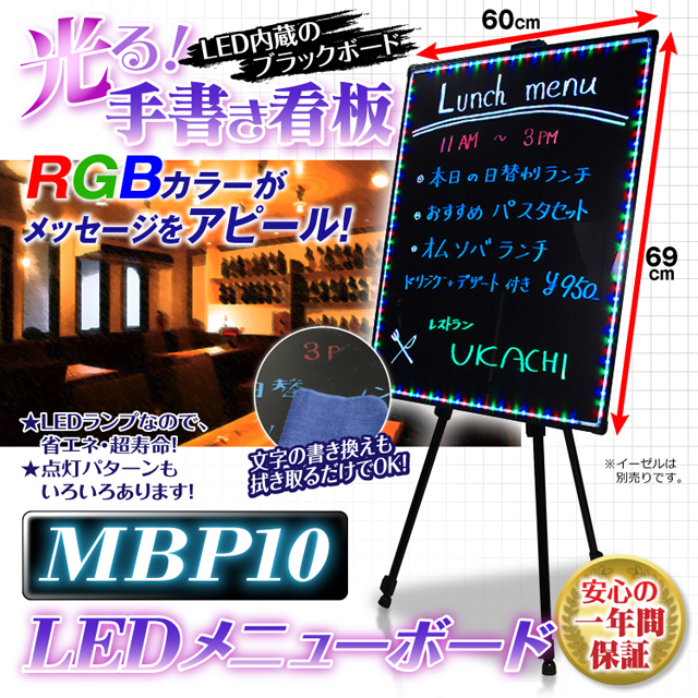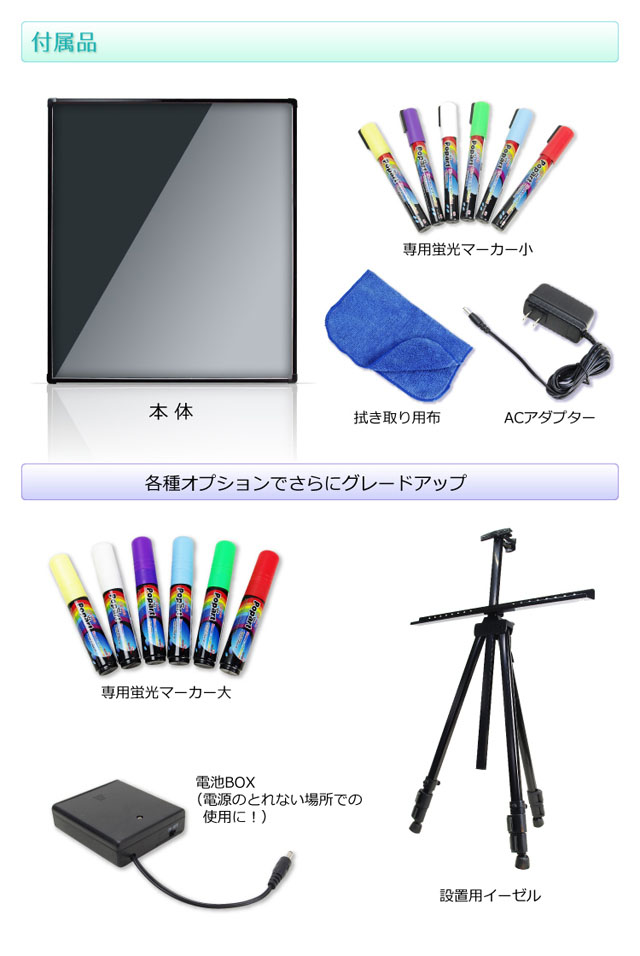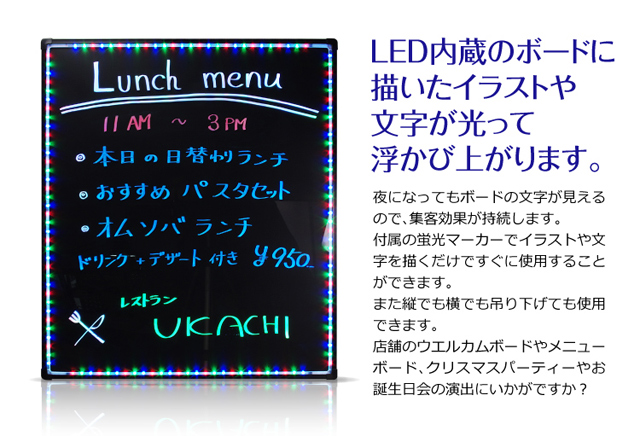 - LED内蔵のボードに描いた絵や文字が光る。今まで、黒板を利用していた方からのご要望で「LEDメニューボード」は開発されました!
