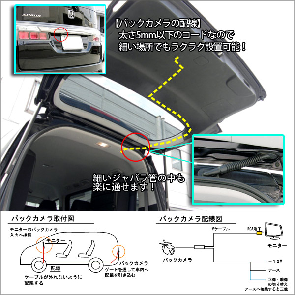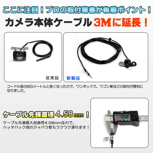 - 従来のカメラ本体ケーブル約60cmを3mに大幅延長することで、取付が大幅に楽になりました!ケーブル先端最大部直径4.65mmなのでハッチバック部のジャバラ管もラクラク通ります!