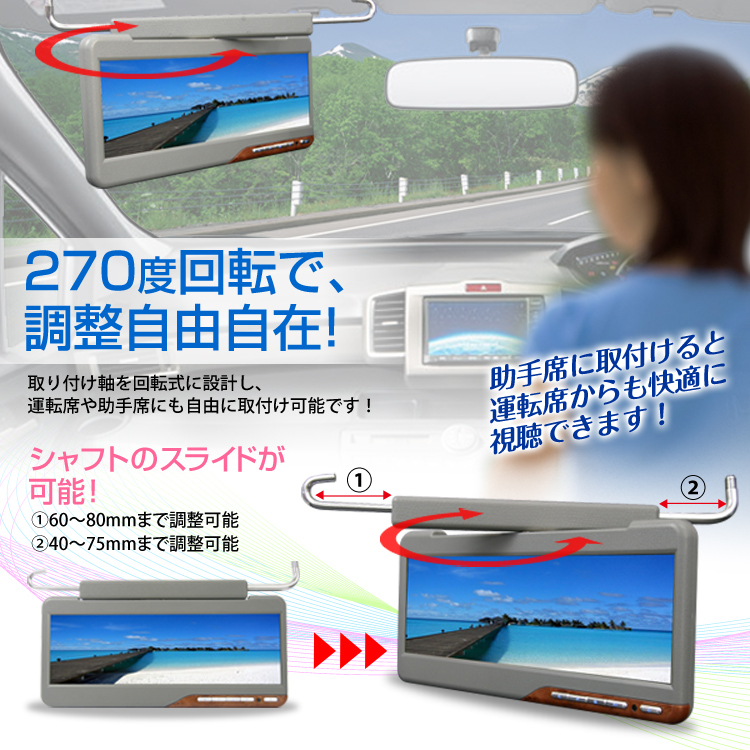 - 従来品の片側調より、ダブル調整機能を進化しました。本体コンパクトサイズ、更に多くの車種を対応可能です。更に取付軸を回転式設計、運転席や助手席に自由に取付可能です。