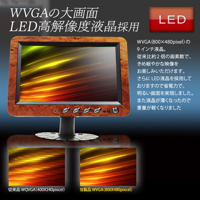 - LEDバックライト搭載WVGAデジタル液晶を用いられ、高解像度、高輝度、広角表示、従来比約2倍のきめ細い画素数、緻密な映像を楽しめます。