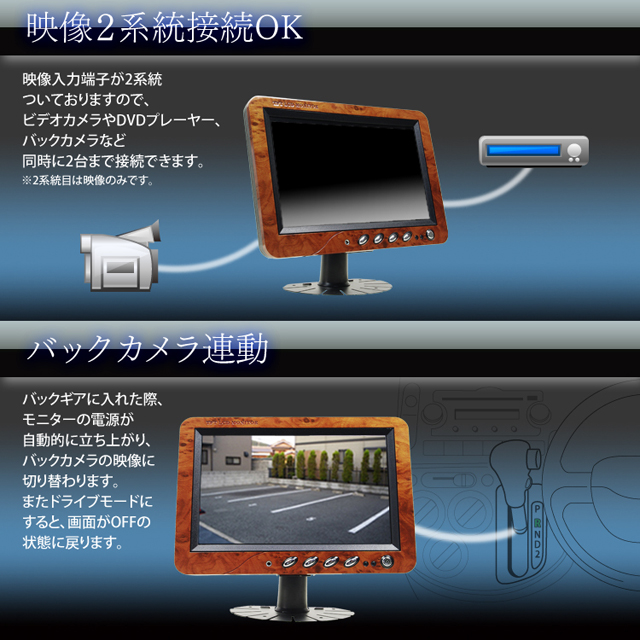 - 専用バックカメラ連動仕様、バックギア入れると自動的にバックカメラの映像に切り替わります。 (V2対応)