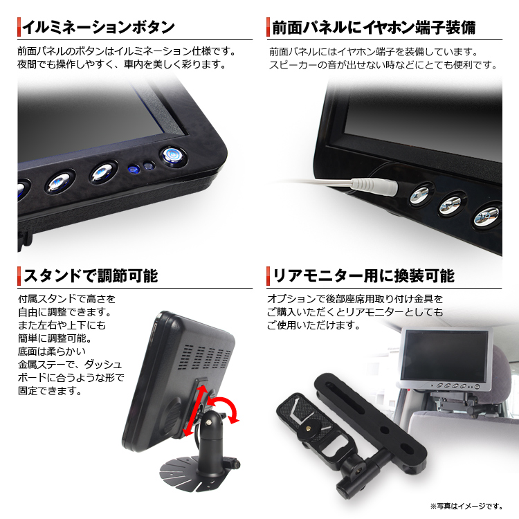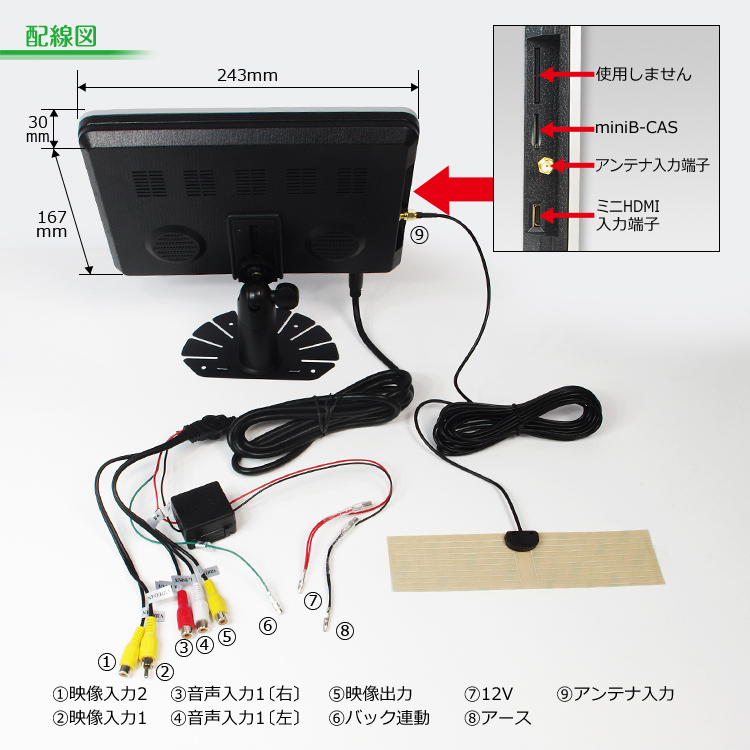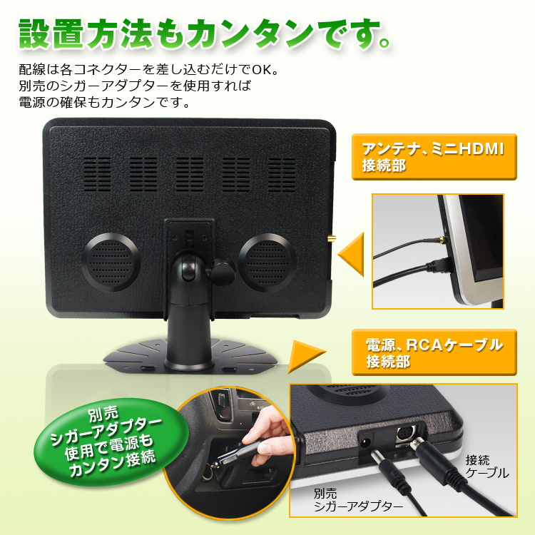 - 映像や音声などの入力は全て汎用性高いRCA端子を採用し、カーナビ、DVDプレーヤー、バックカメラなどは簡単に接続