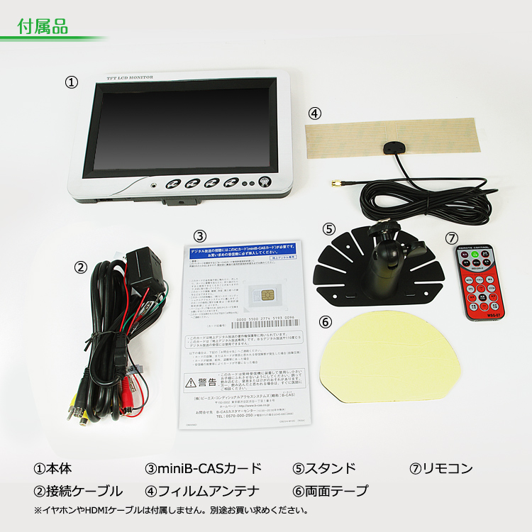 - モニター本体x1,電源・音声信号入力ケーブルx1,リモコンx1,取付スタンドx1,mini-Bcasカード,フィルムアンテナ,日本語取付説明図