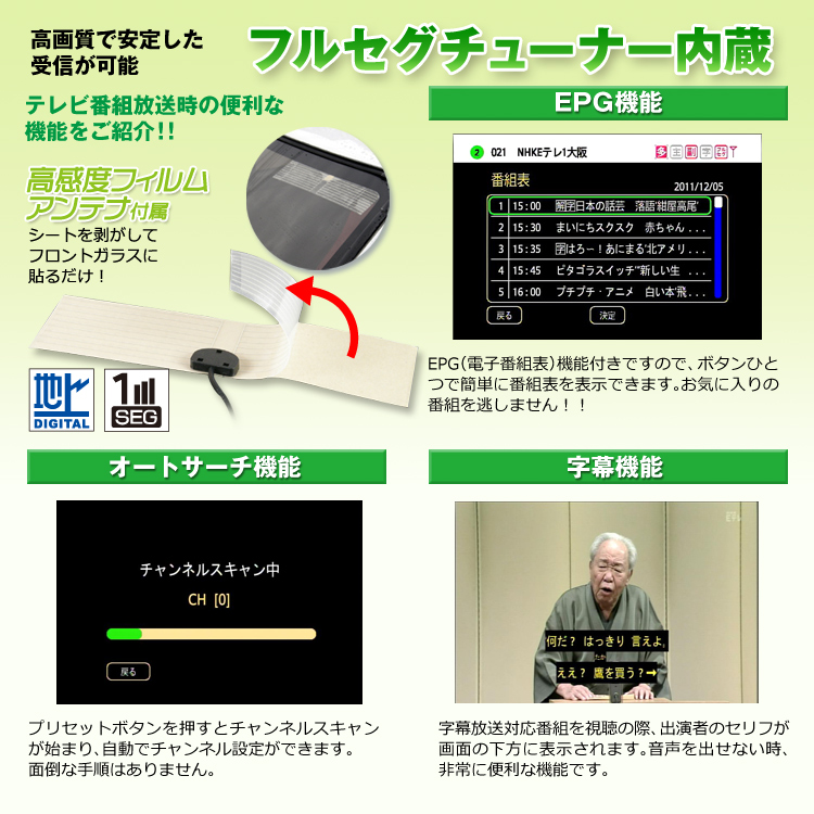 - 車載専用地上波デジタルチューナー内蔵、受信状況によりフルセグ(解像度1920×1080)放送⇔ワンセグ(解像度320×240)放送の自動切替機能搭載します。所在地の信号状況に従って、最適な地デジ放送サービスを提供可能です。